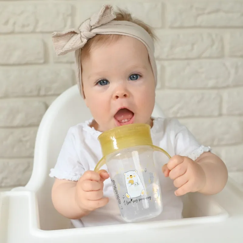Puodelis mokomasis, tad galima gerti iš bet kurios gertuvės vietos, taip kaip ir iš suaugusiojo puodelio.