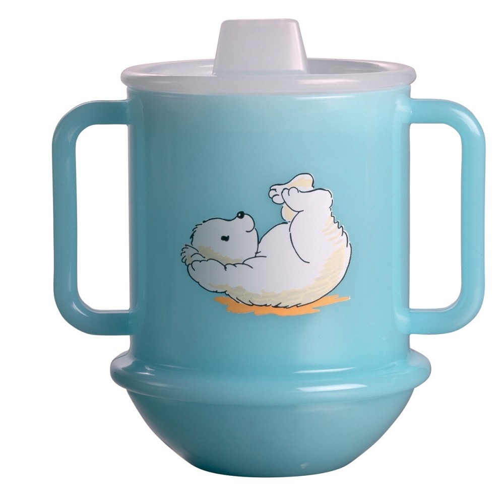 Vaikiškas puodelis su specialiu dugnu; kuris neleidžia puodeliui apsiversti.